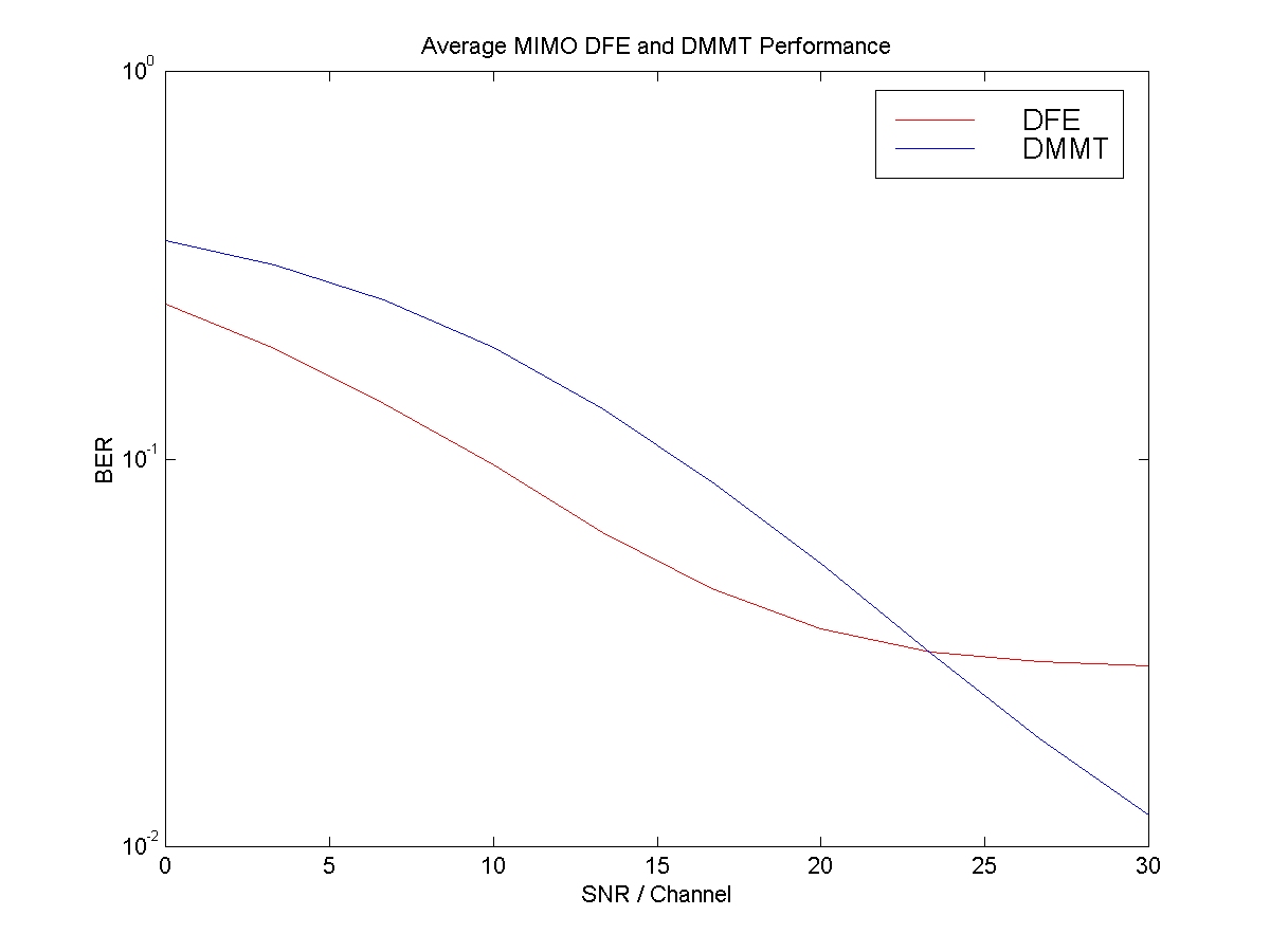 The DMMT was implemented somewhat smoothly, without any large apparent errors. Results are as expected, and channel decomposition computation time was not excessive (as might have been feared). The MIMO DFE implementation was much more difficult. Despite the fact that the results presented in [2] for a 2x2 channel were easily repeated, when the system was expanded to optimally create more than one tap in the feedback filters, the performance degraded tremendously. This suggests an implementation flaw. However, the implementation seemed to be working for the obvious cases (e.g., diagonal channels), so it is unclear what, if anything was wrong. One possibility might be that because the optimal feedback filter settings are calculated assuming perfect decisions, they do not take the error propagation that will increase as the number of feedback taps increases. To ensure that implementation was not at issue, further work on this front would be a good idea.