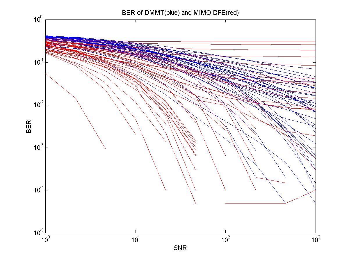 The results are shown in the figures below. Notice that the DMMT almost always performs slightly more poorly than the DFE. (This is in addition to the data rate penalty that is incurred because of the block prefixes.) However, in certain (perhaps pathological) cases, the DFE performs very poorly, whereas the DMMT is consistent. This suggests the classic problem with decision-feedback, error propagation, is not only present in MIMO situations, but even worsens. The average BER curve for the DFE displays the classic shape of an error floor. While it's nice to think that this is a result of error propagation, this is not clear. The limiting BER may also be (in some way) a result of the channel model.